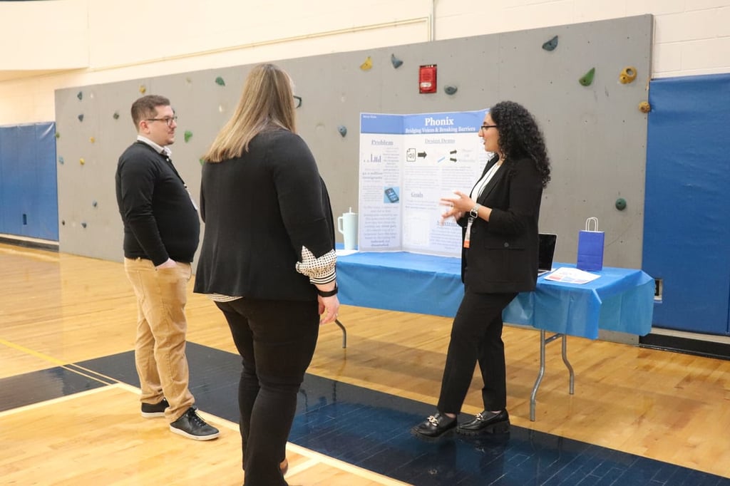 Meray Khela presents Phonix: Bridging Voices & Breaking Barriers to a judge at the Medway High School Innovation Showcase on May 1. (Photo courtesy Medway Public Schools)
