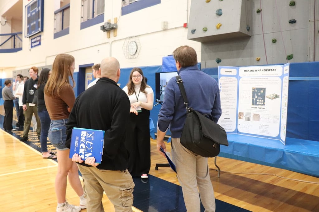 Maggie Kerr presents Make a Makerspace to a judge at the Medway High School Innovation Showcase on May 1. (Photo courtesy Medway Public Schools)