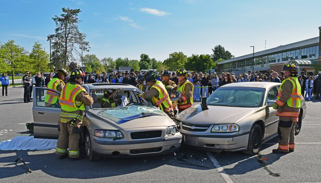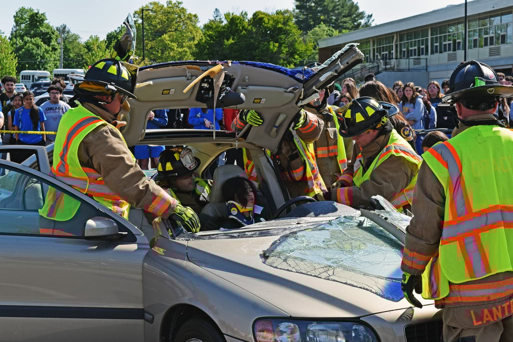 “This event is designed to allow students to have a front row visual representation of an emergency motor vehicle crash in a controlled setting,” said Dracut Fire Lt. Brian McCarthy, who organized the crash. “The event is not meant to scare the students. Instead it’s meant to bring awareness and dialogue to a topic that is often hard to drive home.”