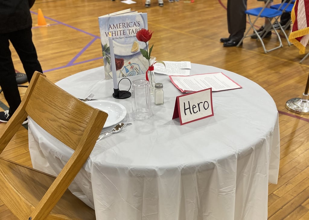 Alison Griffin, Library Media Specialist, also presented and explained the White Table to students and school community as a way to honor fallen heroes. The White Table is one of many identical tables at VA medical facilities and U.S. military bases across the globe. Each is set the same way, symbolizing those missing or captured, and those waiting for their return.