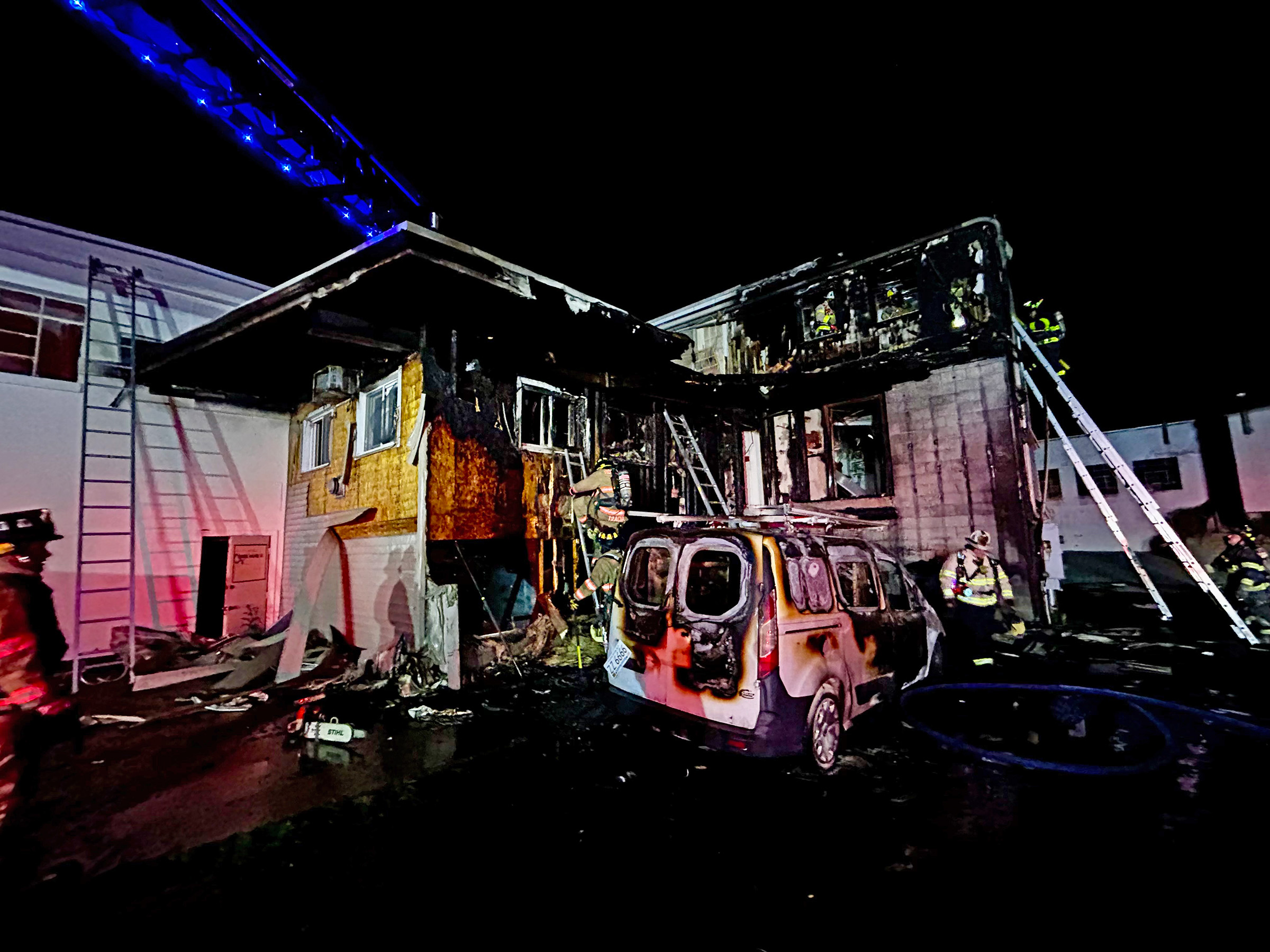Firefighters arrived to find heavy fire showing from the rear of the building with two people trapped on the building’s roof while trying to escape the fire.