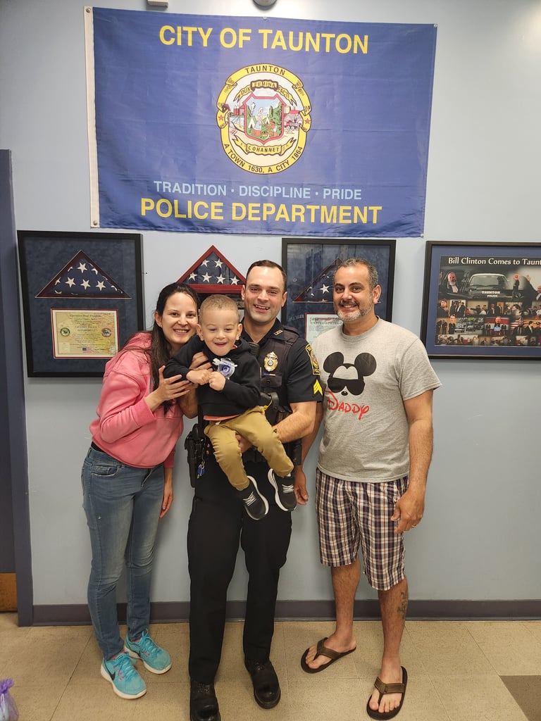 Sgt. Matthew Laranjo was greeted at the Taunton Police station on Thursday, May 30, by 2-year-old Joseph Teodoro and his parents Rafaella Teodoro and Magnun Teodoro. The family thanked Sgt. Laranjo for helping to save Joseph’s life.