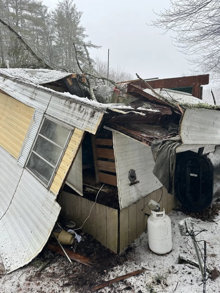 On April 4, at about 8 a.m., a 70-foot-long pine tree branch fell onto a trailer home on Depot Road during a Nor’easter, bringing with it thousands of pounds of debris. Homeowners Dave Scaggell and Jennie Wadleigh, along with their cat, were inside and narrowly escaped injury. The home was declared a total loss.