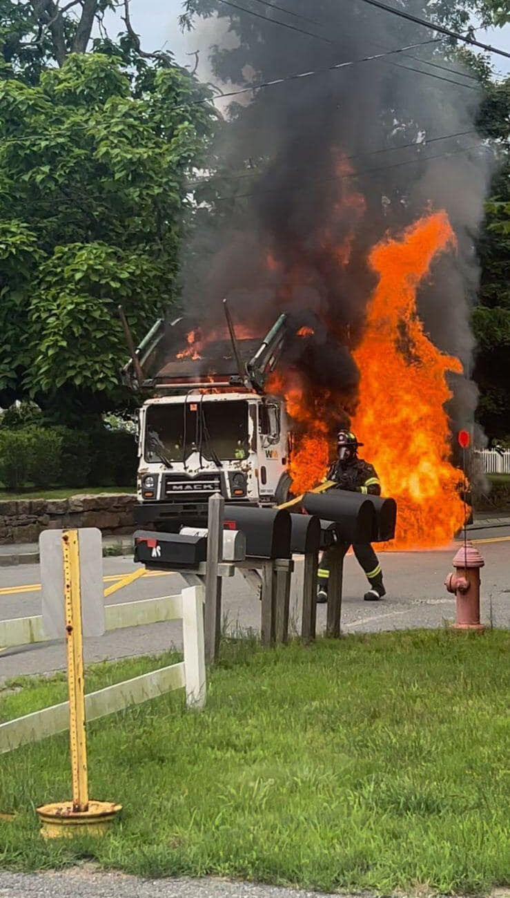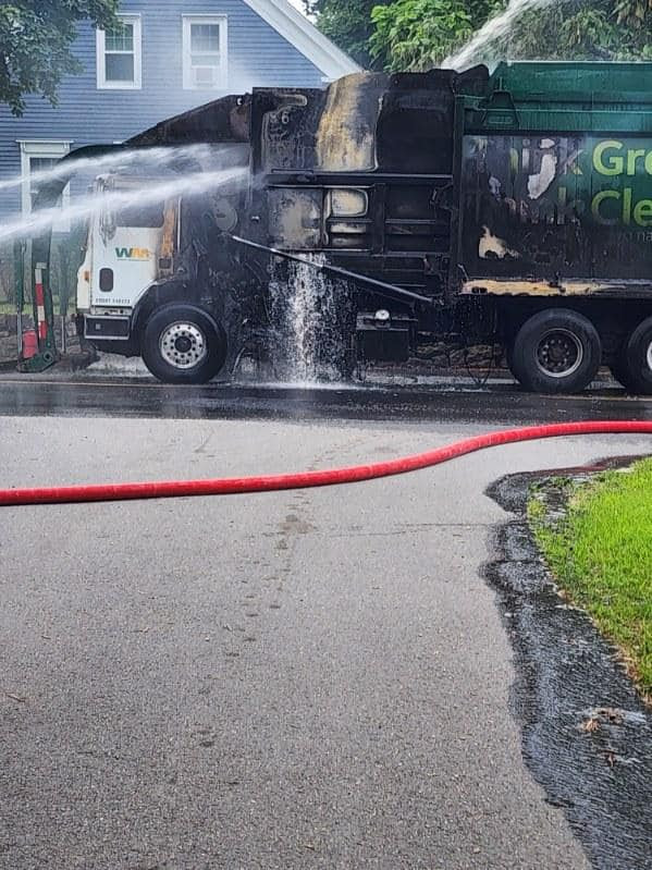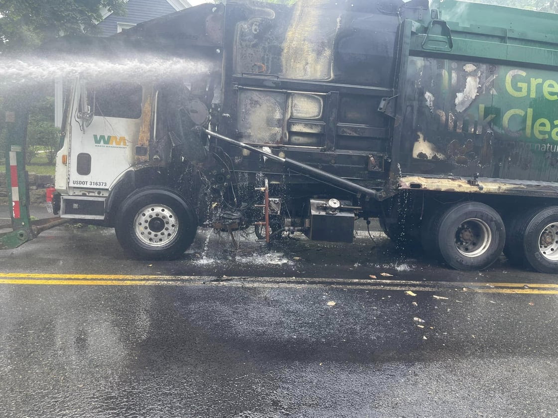 Dispatchers received a call at 12:37 p.m. Thursday, July 18, about a garbage truck on fire near the intersection of Front Street and Washburn Park Road. Upon arrival, crews discovered the truck engulfed by flames. This truck was fueled by compressed natural gas (CNG).