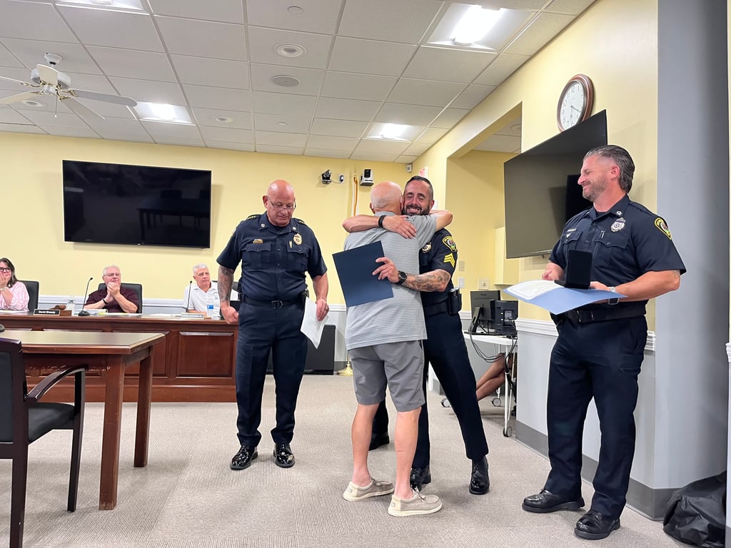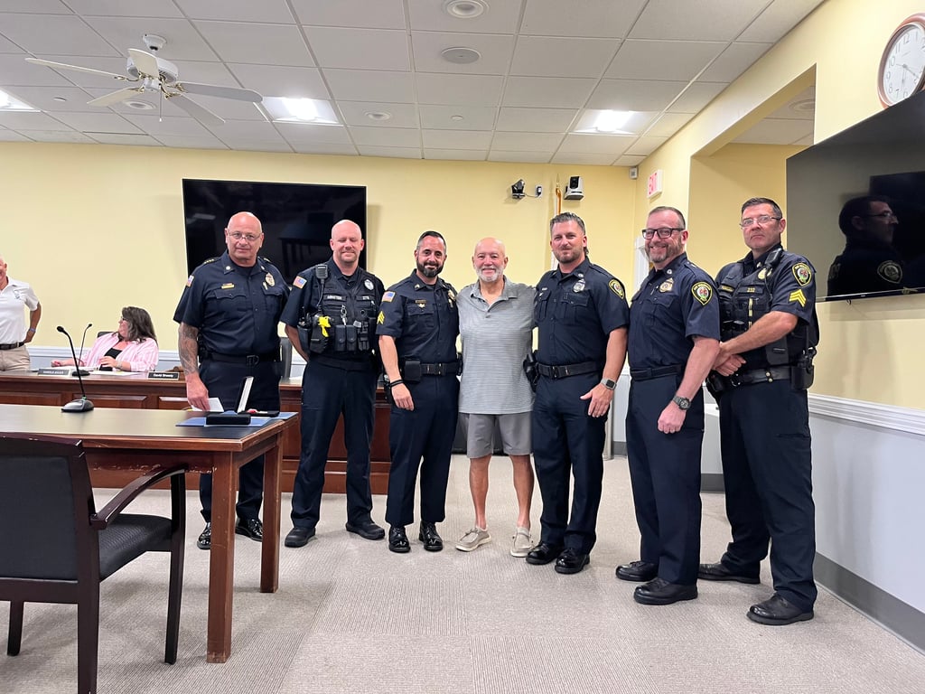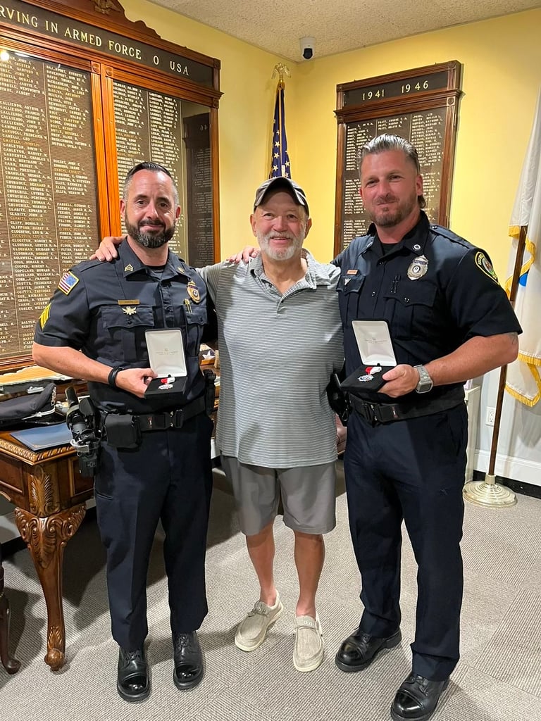 At Monday’s Select Board meeting, Sgt. Andre and Officer Monteiro were recognized and presented with a Lifesaving Award by Chief Jenkins, Deputy Chief Michael McLaughlin and Select Board members David Sheedy, Carole Julius and Peter Spagone Jr. Also in attendance was Larry Davidson, whose life was saved by the officers, and his wife Florence, as well as family, friends and other police officers.
