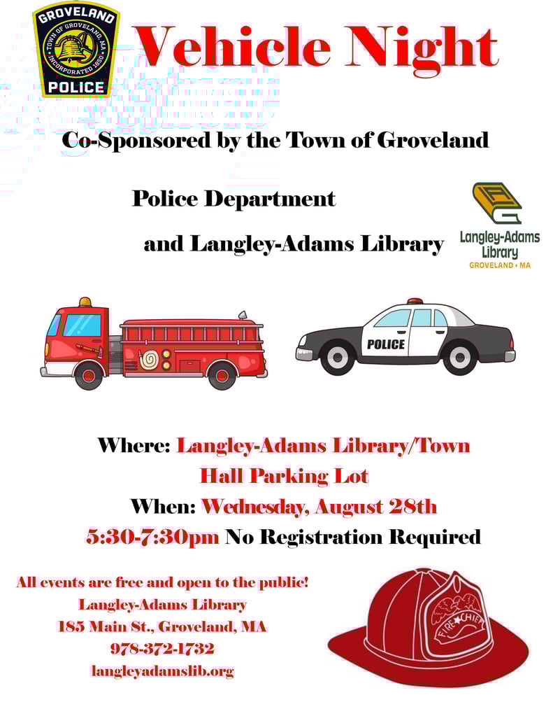 GROVELAND — Police Chief Jeffrey Gillen and Langley Adams Library Director Darcy Lepore are pleased to share that the Groveland Police Department and Langley Adams Library are hosting a Vehicle Night for community members.