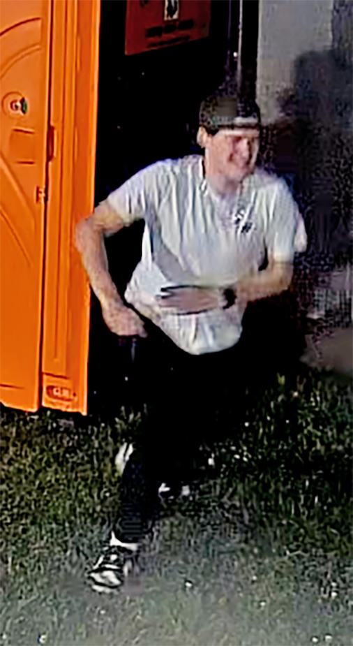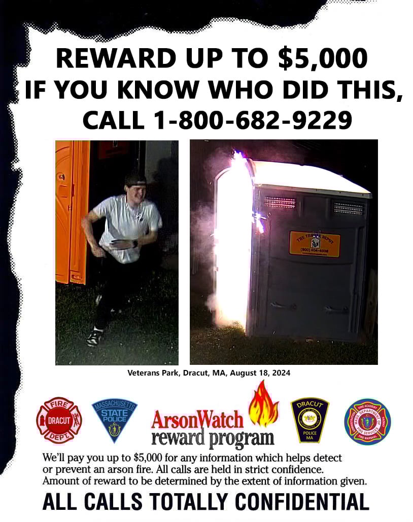 DRACUT — Police Chief Peter Bartlett and Fire Chief Richard Patterson report that the Dracut Police and Fire Departments are seeking information on a man who used fireworks to set fire to a porta potty at Veteran’s Memorial Park. They urge anyone with information to contact the Arson Watch Reward Program, which offers rewards of up to $5,000.
