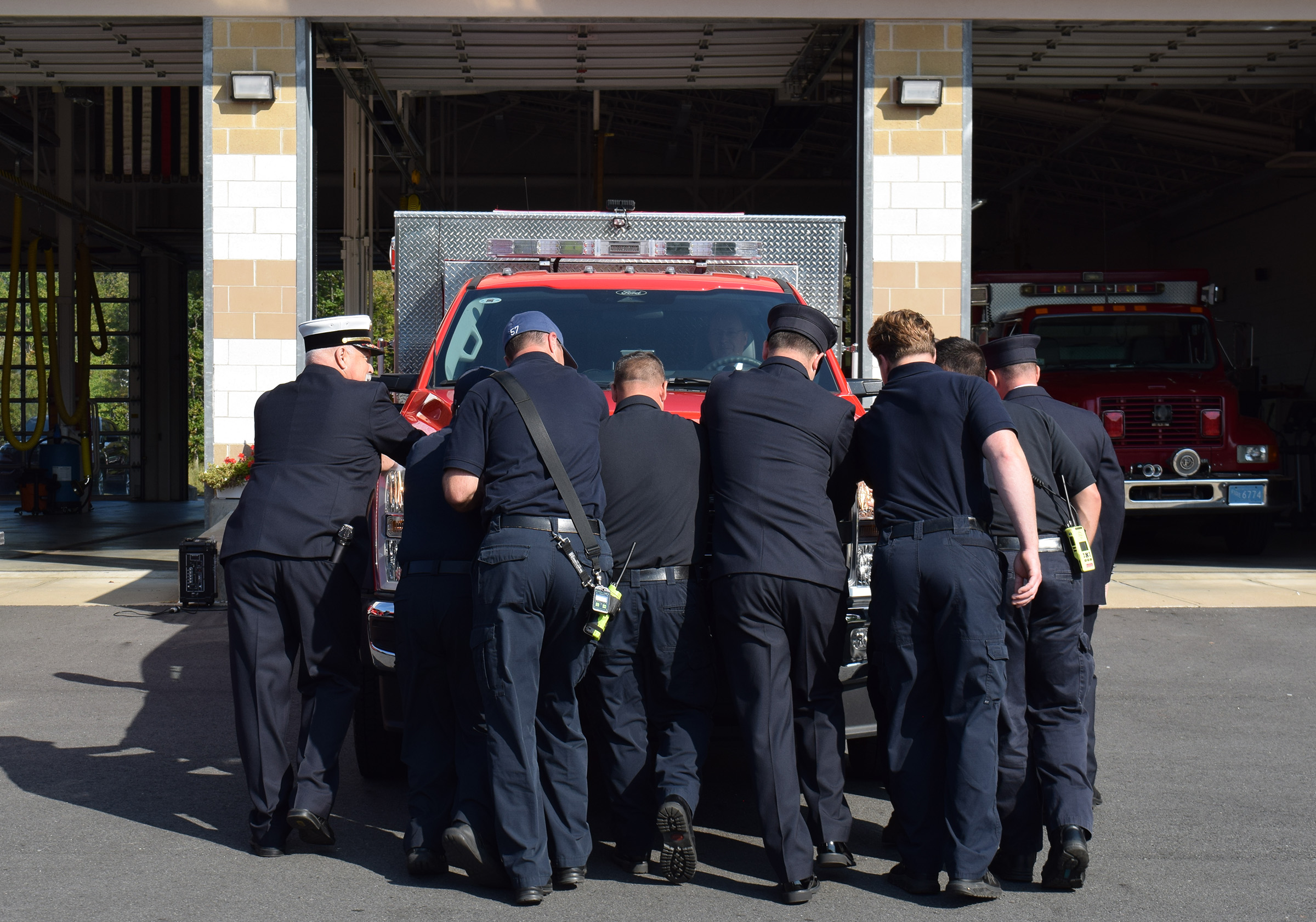 A pushing in ceremony is a tradition that dates back to the days of horse-drawn fire carriages, which would be detached from the horses and pushed back into fire stations since horses cannot walk backward.