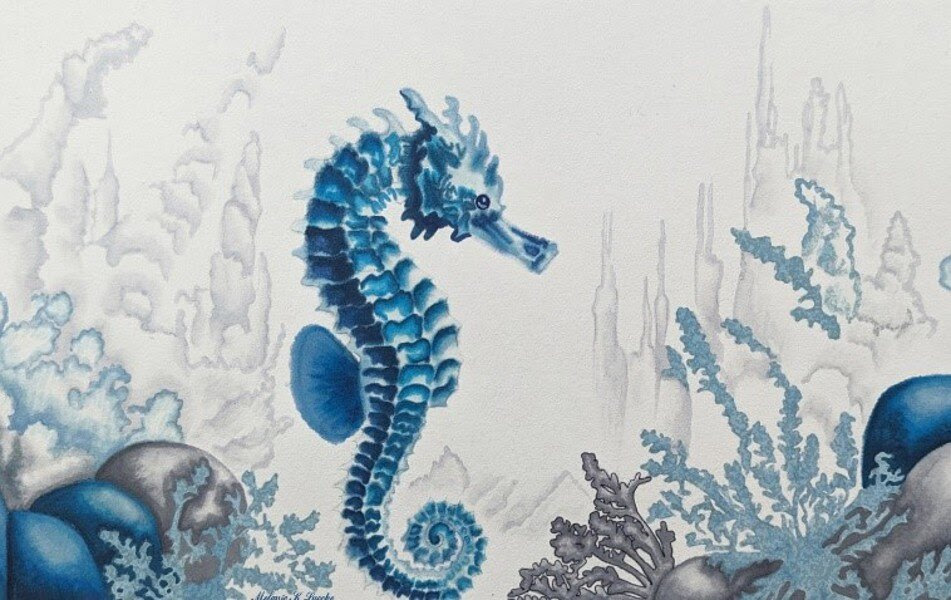 She explains, “As the winter winds whisper through the northern realms, the stately seahorse of ‘The Nordic King’ stands as a monarch in his icy domain. This artwork, a study in the stark contrasts and serene blues of the frigid season, is rendered with a disciplined palette of blues and a singular shade of gray. The original alcohol-based marker creation explores the emotive strength of color and space. The untouched white of the paper conveys an unspoken narrative, allowing the scene to resonate with the chill of the Nordic winters and the silent dignity of its underwater sovereign.”