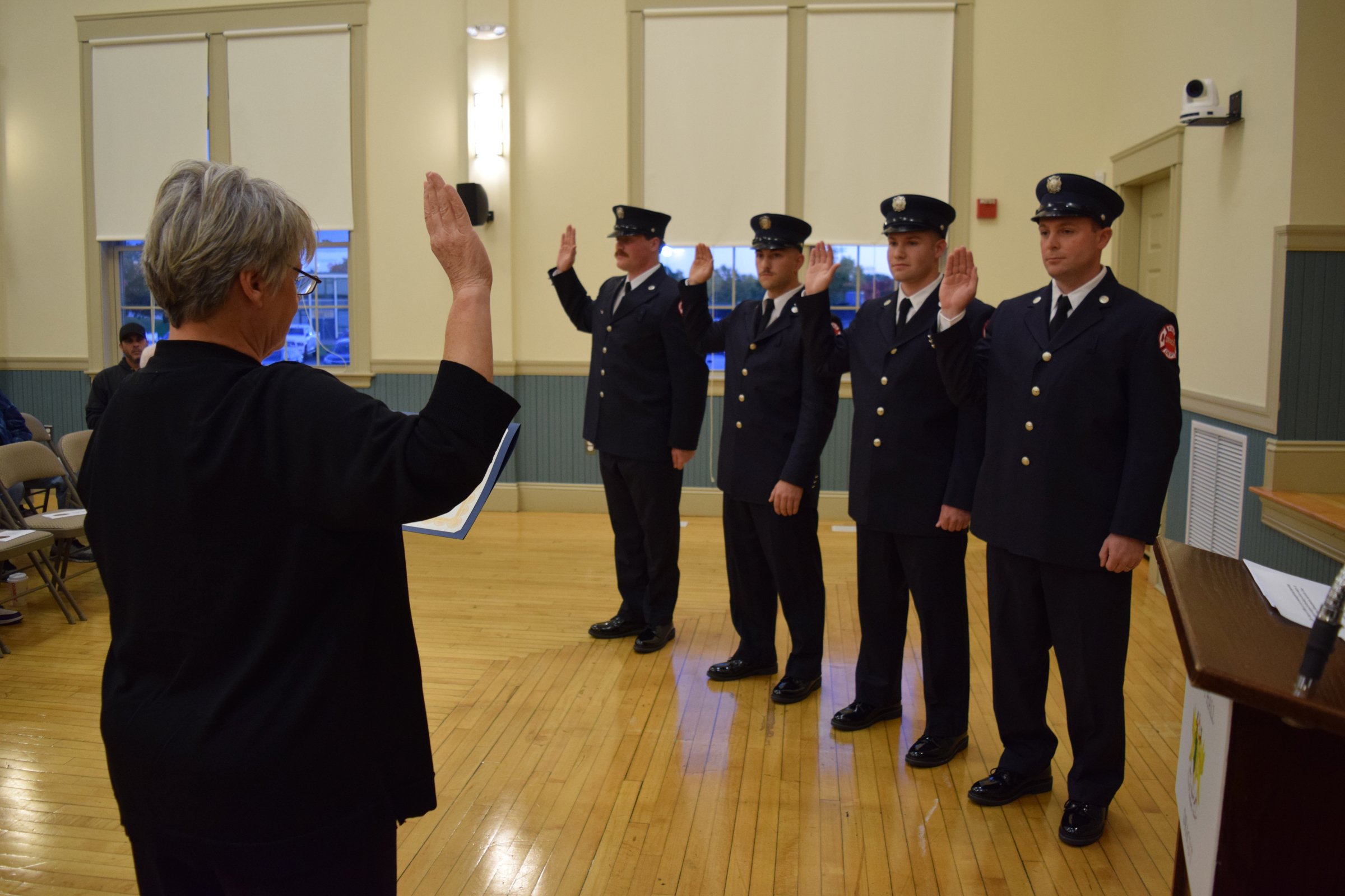 The event started with the swearing in of four new firefighters. Firefighters Gage Brouillette, Dylan McCarthy, Sean Russell and Ryan Talbot were each sworn in to the department by Town Clerk Jayne Boissonneault, and then had their badges pinned on by family members.