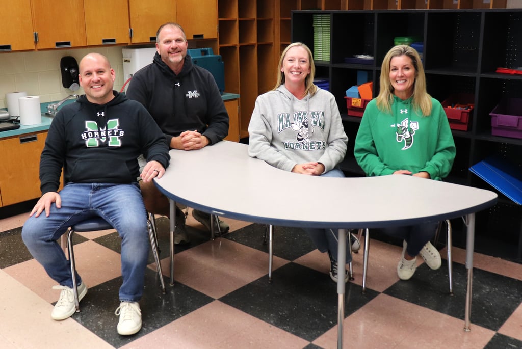 From left, Mansfield Public Schools educators Josh Curry, Steve Dunlea, Meghan McCarthy, and Jill Mansfield sit inside the classroom at Jordan/Jackson Elementary School on Friday, Oct. 25, where Curry teaches now, McCarthy began teaching in 2001, and then Mansfield taught in for years. (Photo courtesy Mansfield Public Schools)