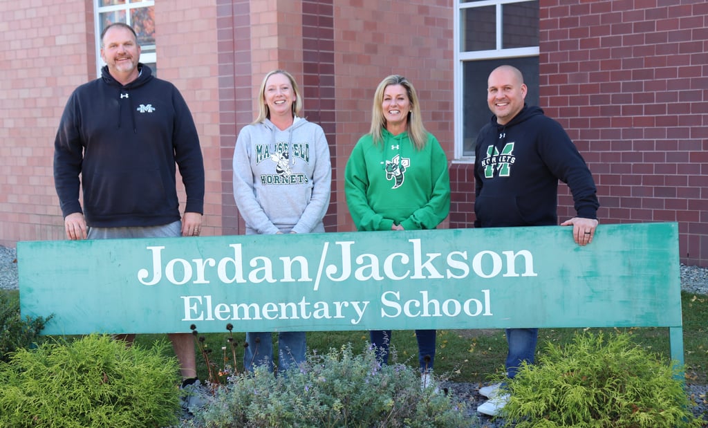 From left, Mansfield Public Schools educators Steve Dunlea, Meghan McCarthy, Jill Mansfield, and Josh Curry inside the hallway at Jordan/Jackson Elementary School on Friday, Oct. 25. (Photo courtesy Mansfield Public Schools)