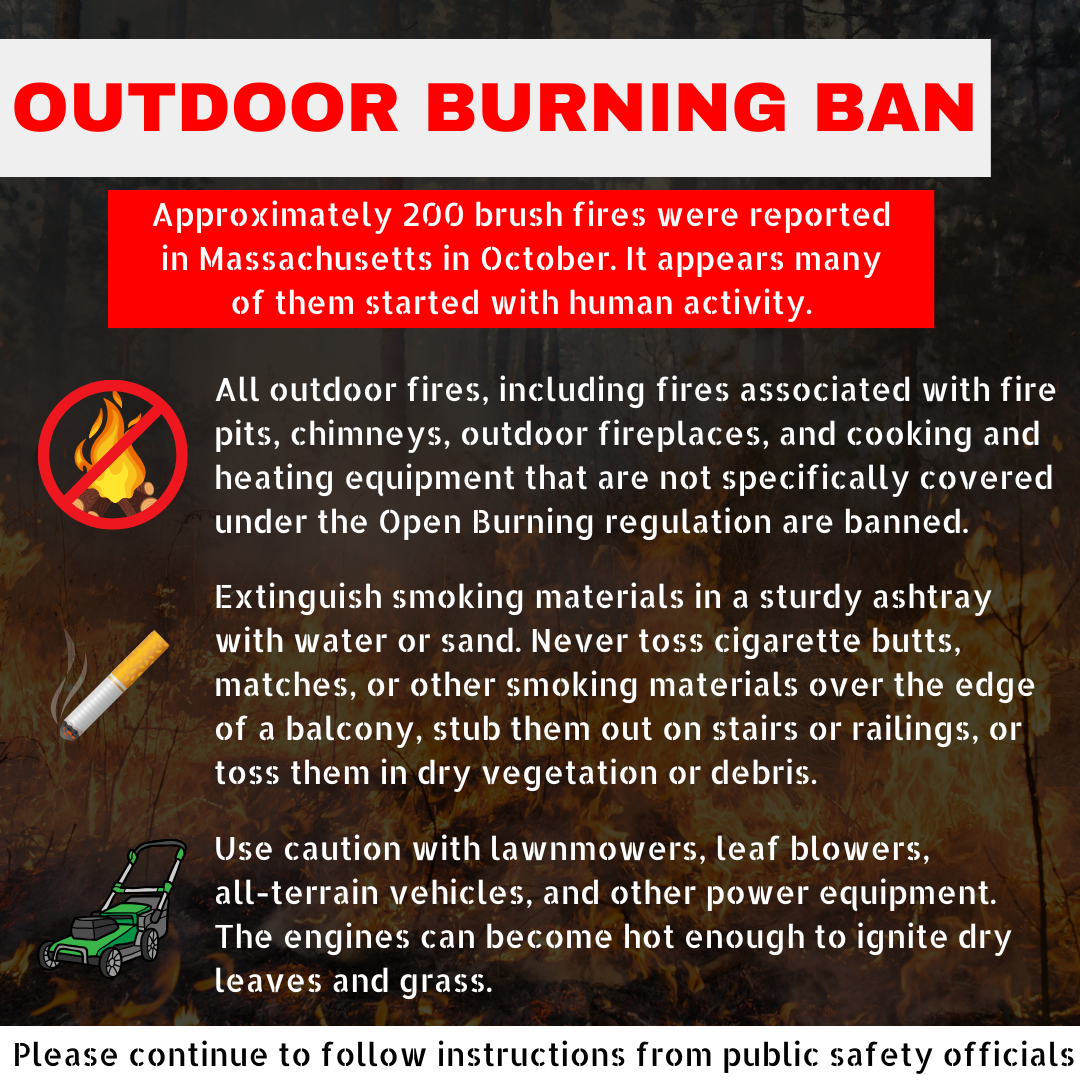 As dry conditions and drought continue, fire risks remain exceptionally high. The outdoor fire ban is authorized under Section 10.10.2 of the Massachusetts Comprehensive Fire Safety Code, which includes all open, recreational, and cooking fires or other sources of ignition outdoors, such as fires associated with fire pits, chimineas, outdoor fireplaces, and cooking and heating equipment that are not specifically covered under the Open Burning regulation.