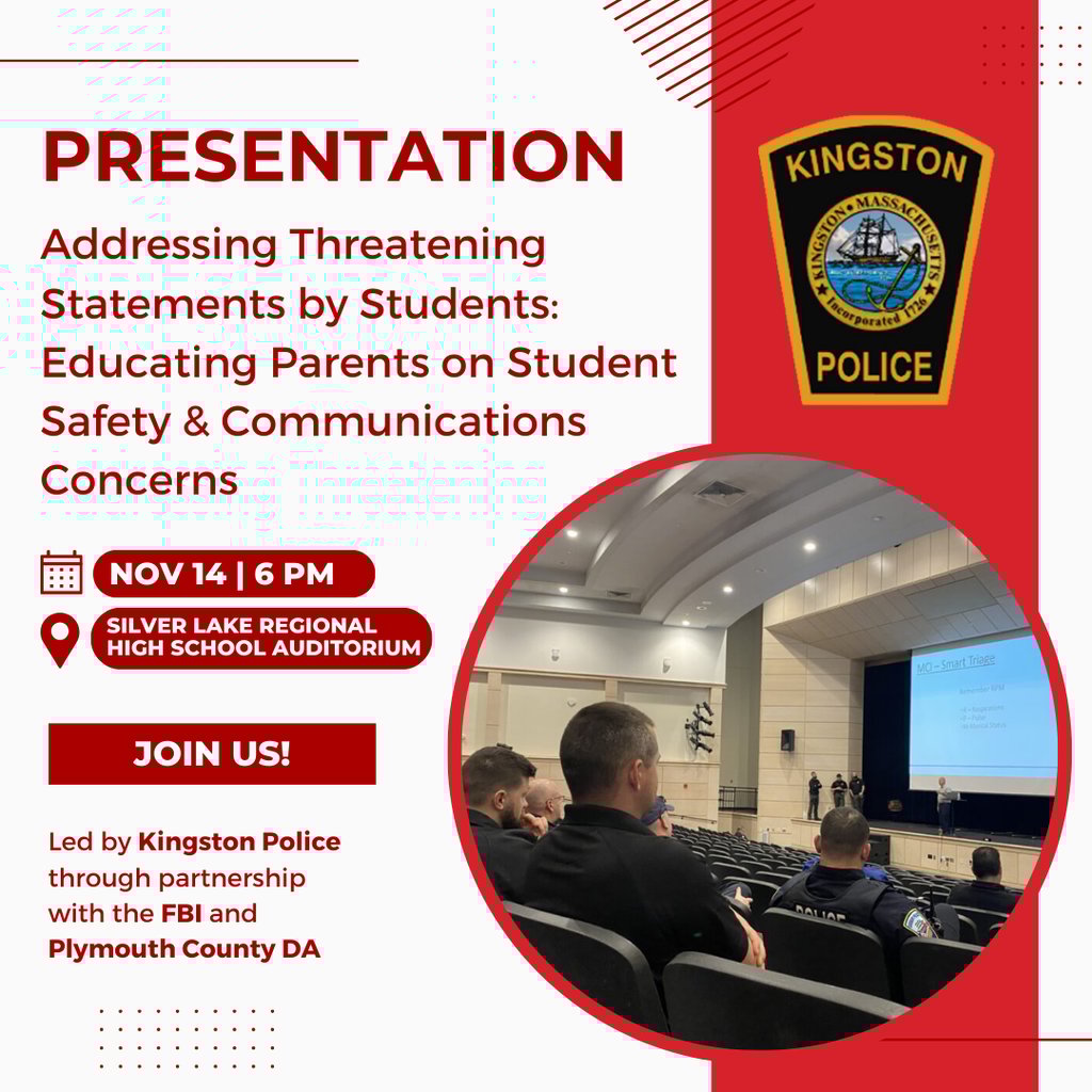 KINGSTON — Chief Brian Holmes is pleased to announce that the Kingston Police Department, in collaboration with the Silver Lake Regional School District, Plymouth County District Attorney’s Office, and the FBI, is hosting a presentation for parents this week titled “Addressing Threatening Statements by Students: Educating Parents/Guardians on Student Safety and Communication Concerns.”