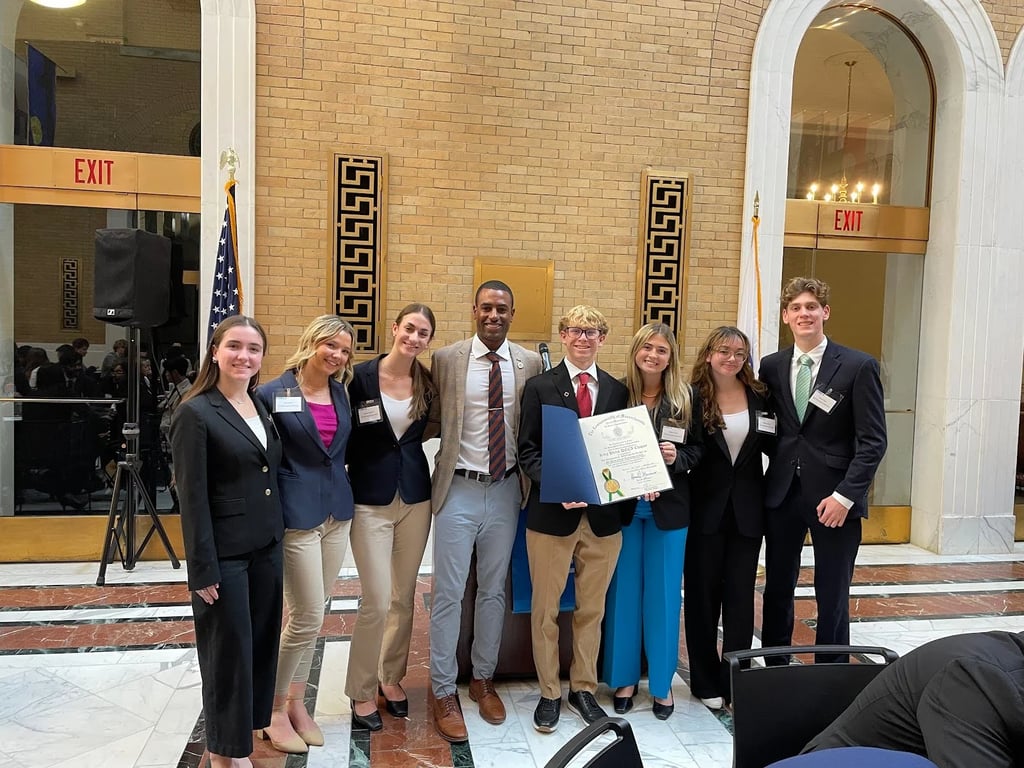KP DECA officers pose for a photo with State Rep. Marcus Vaughn, who presented the group with a certificate. (Photo courtesy King Philip Regional School District)