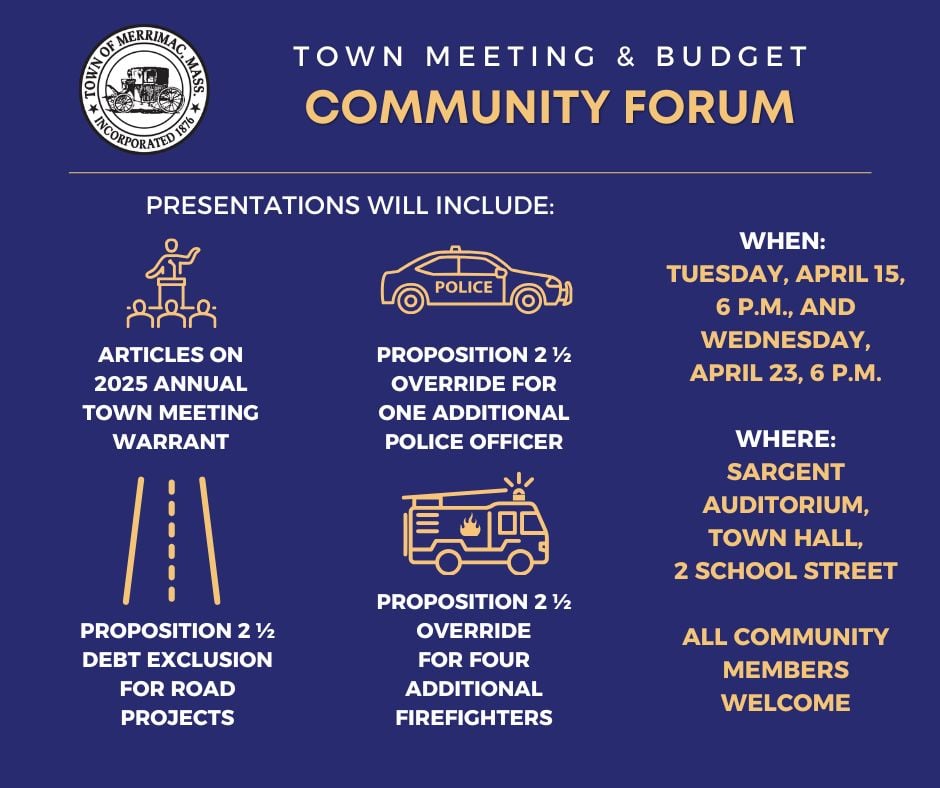 MERRIMAC – Merrimac residents are invited to attend two public forums to learn more about Town Meeting warrant articles, as well as Proposition 2 ½ override and debt exclusion questions that will be posed to voters in the coming weeks.