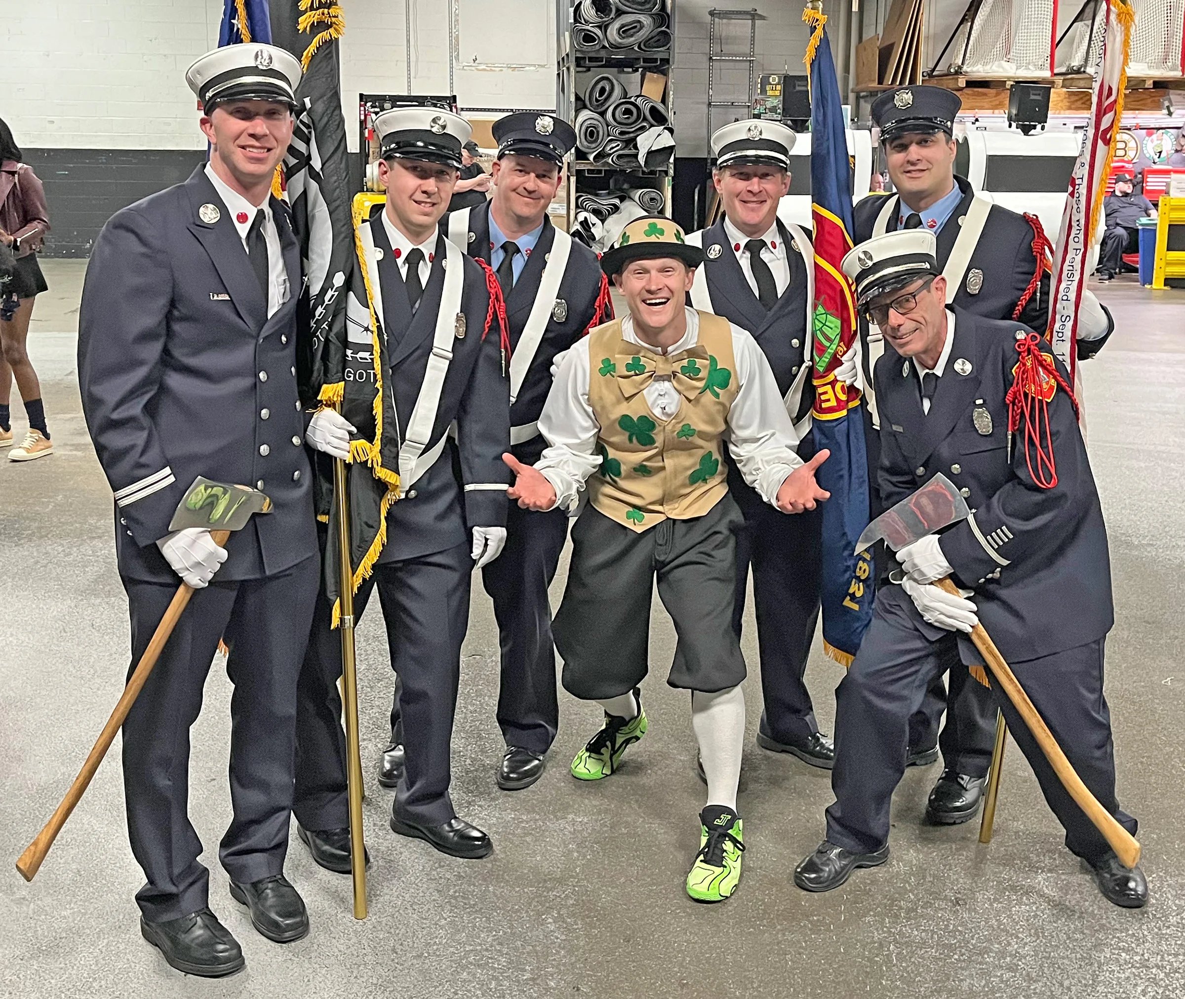 Members of the Gloucester Fire Department Honor Guard stand with Boston Celtics mascot Lucky after presenting the colors at the Celtics game on Friday, April 11. From left are Capt. Kevin Gargan, Lt. Jim Hannon, Lucky, Firefighter Joe Johnson, Capt. Nick Ouellette, Lt. Tom Sayess and Firefighter Ishi King. (Photo Courtesy Gloucester Fire Department)