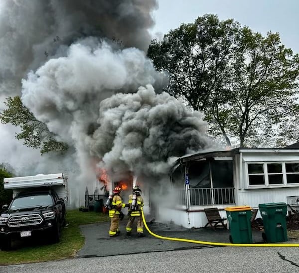 Plymouth firefighters battle a fire in a mobile home on Indian Trail on Monday. (Photo Courtesy Peter Walsh)