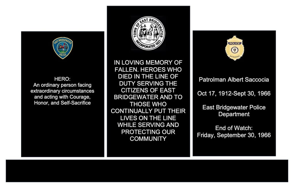 Though he is recognized on both the National Law Enforcement Officers Memorial in Washington, D.C., and the Massachusetts Law Enforcement Memorial in Boston, no local memorial exists in his name — until now. After 58 years, the Albert Saccocia Memorial Fund will honor Patrolman Saccocia’s sacrifice with a permanent memorial in front of East Bridgewater Town Hall, overlooking the police station.