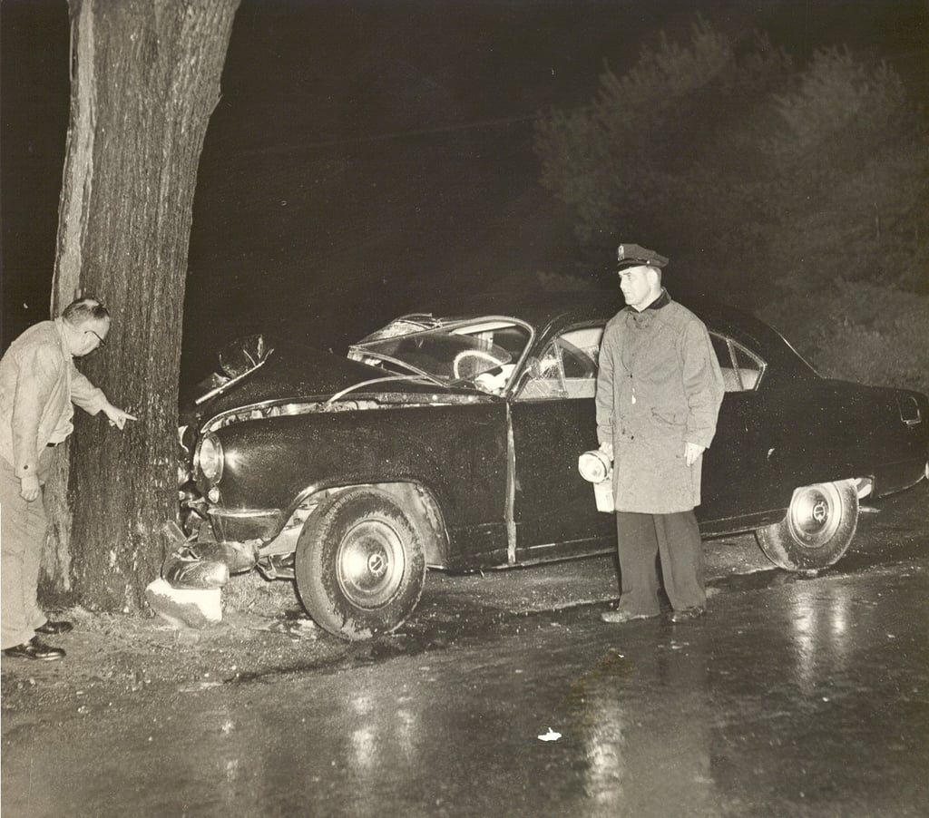 East Bridgewater Police Department Patrolman Albert Saccocia investigates a crash in the 1950s. (Photo Courtesy East Bridgewater Police Department)