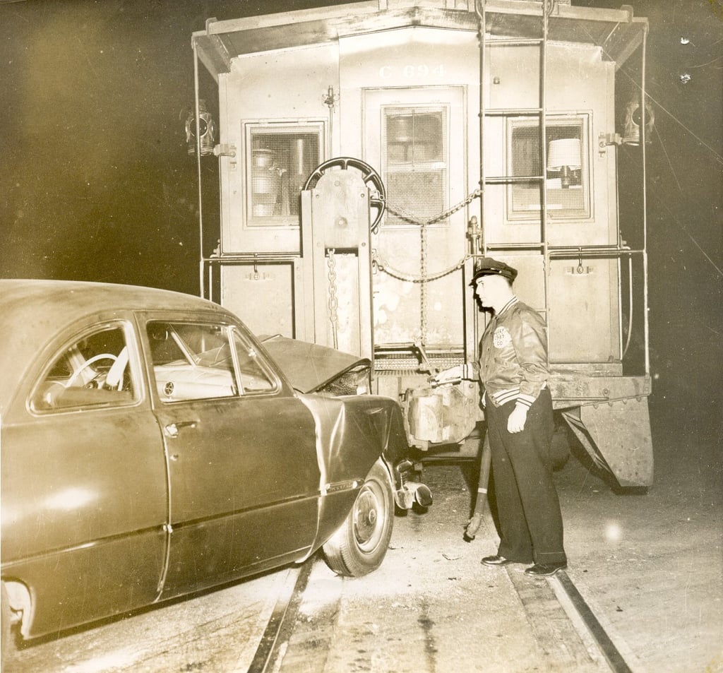 East Bridgewater Police Department Patrolman Albert Saccocia investigates a train crash in the 1950s. (Photo Courtesy East Bridgewater Police Department)
