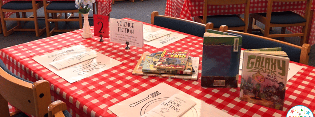 In addition to tasting cards, diners found books from that specific genre in the center of each table. Students took 3-5 minutes to “taste” their chosen book by sampling a few pages. Readers rated the books and provided their first impressions of that literary course. After about five minutes, students rotated to the next tasting table and experienced a different genre.