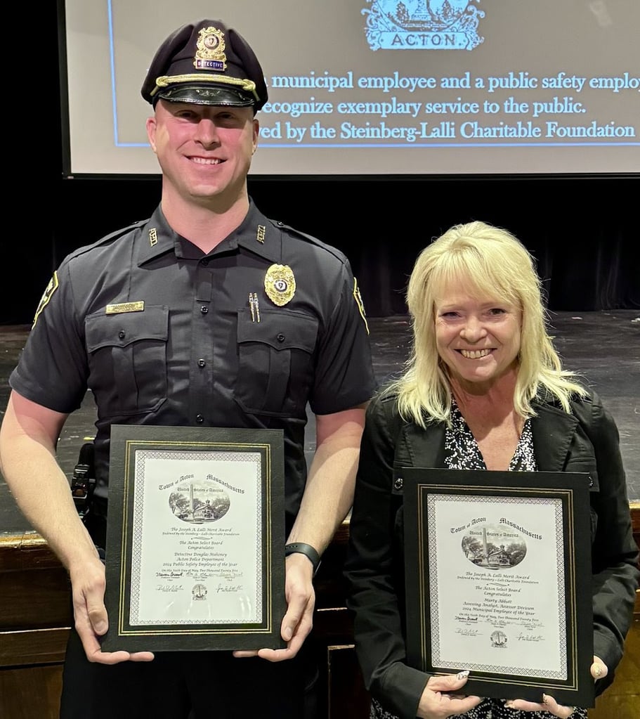 ACTON — Town Manager John Mangiaratti is pleased to announce the 2024 Joseph A. Lalli Merit Award for Municipal and Public Safety Employees of the Year: Assessing Analyst Marty Abbott and Police Detective Douglas Mahoney.