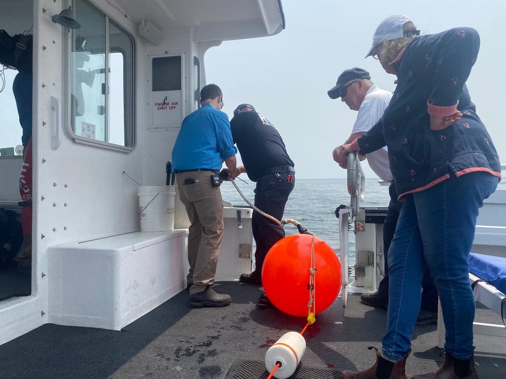 When Captain Jack drove up to the buoy, the crew on board, which included public safety officials and Furey, hoisted the buoy onto the boat. To view a video of the crew pulling up the buoy to prepare and attach a receiver, click here.