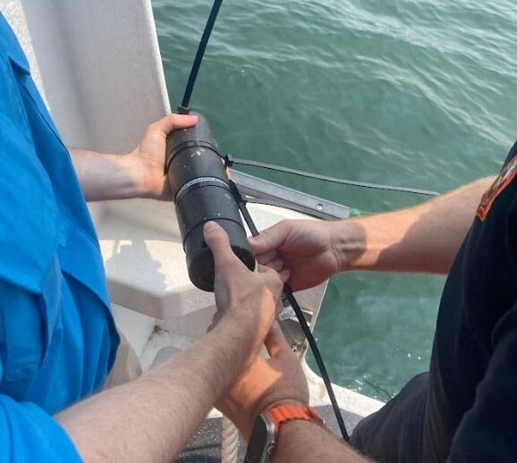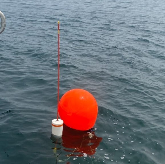 They secured the receiver to the end of the buoy with zip ties and tossed it back into the water. Furey then corresponded with Captain Jack to log the depth of the receiver and its exact GPS location. To view a video of the receiver and buoy being sent back into the water, click here.