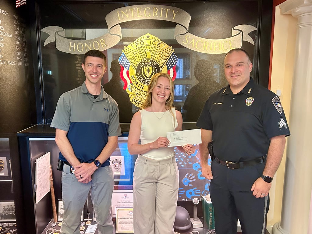 Amazon Robotics Facilities Manager Rachel Bousquet presented the gift to Sgt. Michael Marra and Detective Paul Lucci, who co-founded NRPD’s drone unit in 2021. Amazon Robotics maintains an office in North Reading.