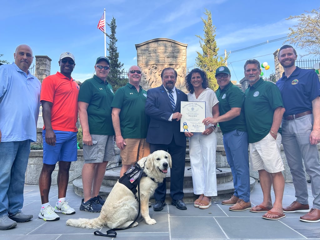 Wrentham officials took a photo with Cruiser, Wrentham’s community resource dog, to celebrate the ribbon cutting at the newly revitalized Sweatt Park. (Photo Courtesy Town of Wrentham)