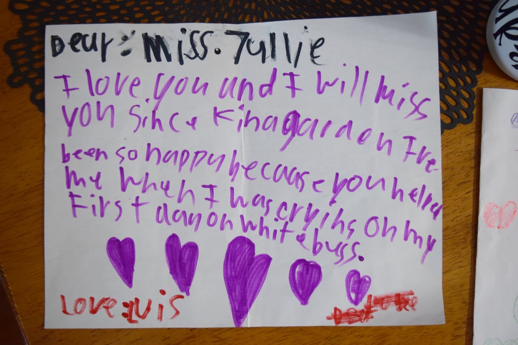 Over tens of thousands of miles, she’s built countless connections with students and their families, receiving thank-you cards, drawings, and invitations to birthday parties.