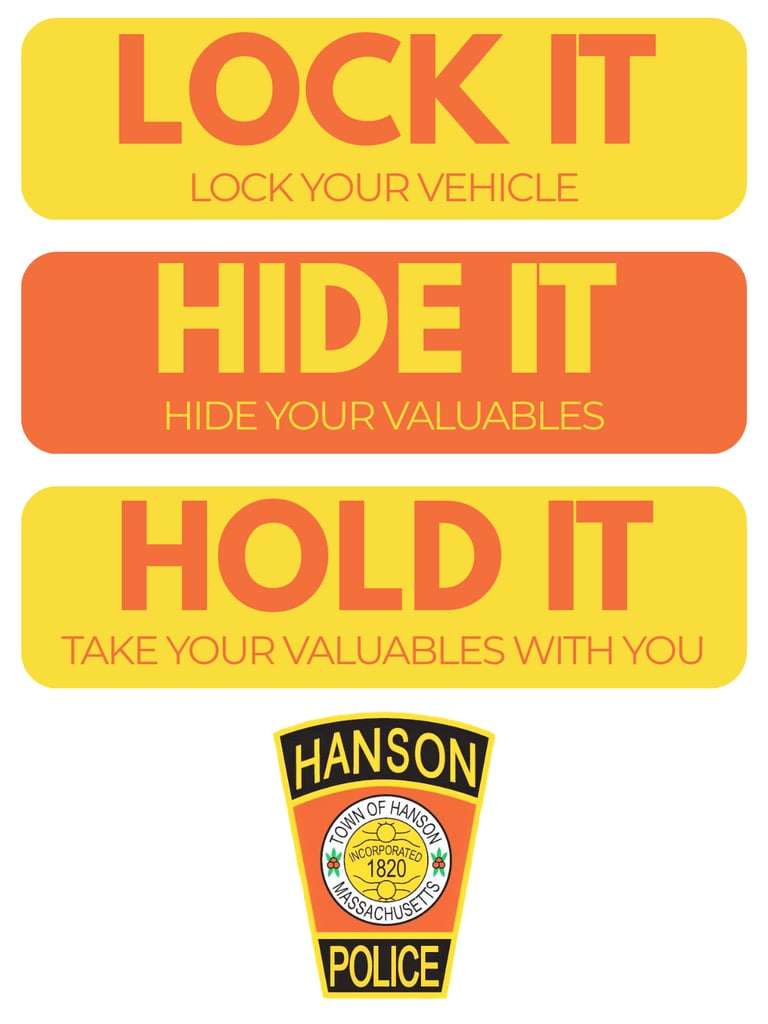 HANSON — Chief Michael Casey and the Hanson Police Department are reminding residents to lock their vehicles and secure belongings after a recent motor vehicle theft in town.