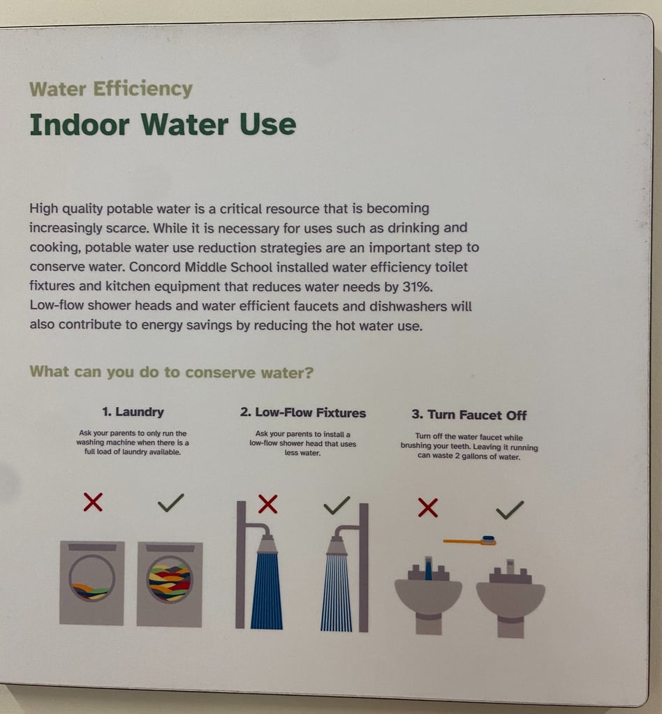 Sustainability signs are posted throughout the Ellen Garrison Building at Concord Middle School, including ones that provide tips for water efficiency regarding indoor water use. (Photo Courtesy Concord-Carlisle Regional School District)