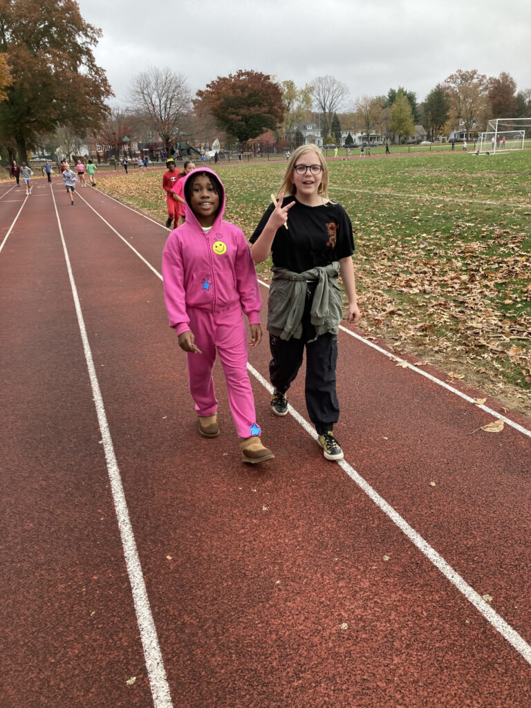 Fifth graders run alongside their kindergarten buddies, encouraging them on the track and celebrating their efforts. Students are welcome to walk, run or roll, ensuring that everyone can take part.