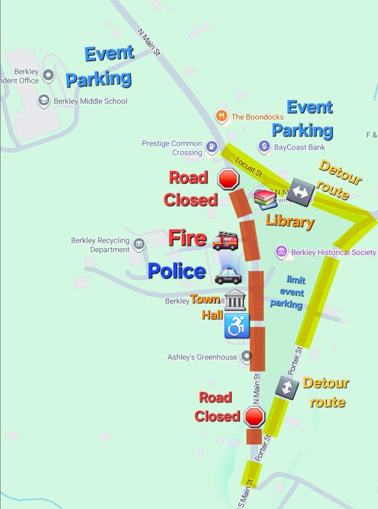 Handicap parking will be located at the Berkley Town Hall. Attendees requiring handicap parking will have to enter and exit via the Porter and South Main Street side of North Main Street.