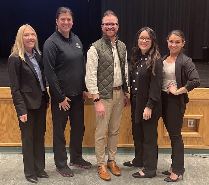 A panel discussion — featuring, from left to right, moderator, Director of Wellness Dot Pearl, and panelists, Pediatric Specialist Monika Page, Civics Teacher Sean Jones, Principal Michelle Kreuzer and Licensed Psychologist Cindy Ballou — followed the screening. (Photo Courtesy King Philip Regional School District)