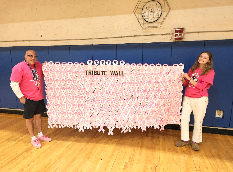 Medway High School Volleyball Coach Shawn Thompson and Captain Mackenzie Klaus held up the tribute wall, composed of personalized ribbons in honor of breast cancer awareness, research and remembrance. (Photo Courtesy Medway High School)