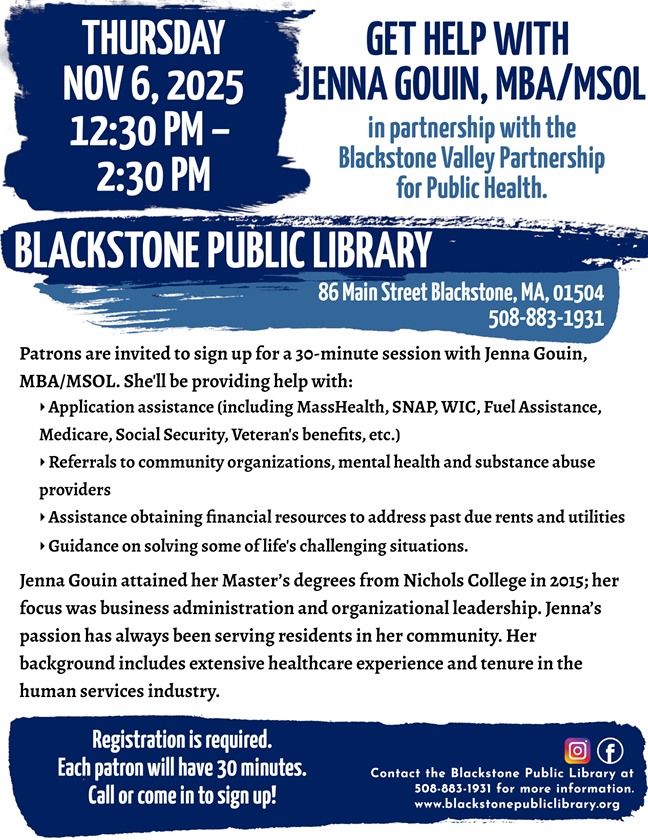 Need assistance with an application for public assistance? How about a referral to a community organization? Jenna Gouin will be at the library to help during her office hours during two separate sessions in November. Book a 30-minute session and get it done. Gouin, who earned master’s degrees in business administration and organizational leadership from Nichols College in 2015, provides assistance to clients through this program in partnership with the Blackstone Valley Partnership for Public Health. Examples of tasks Gouin helps clients with include MassHealth registration, signing up for fuel assistance and applying for Social Security benefits.