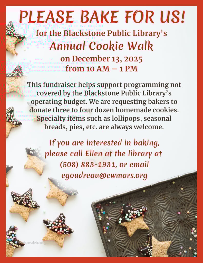 Sign up now to support the Blackstone Public Library by contributing some time and cookie-baking abilities. Bakers are being enlisted for the annual Cook Walk, an important fundraiser held by the Blackstone Public Library to support programming not covered by the library’s operating budget.