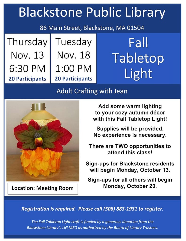 - MORE INFO: Registration is required. Visit the events page at blackstonepubliclibrary.org or call 508-883-1931 to sign up. This event is sponsored by Dean Bank.