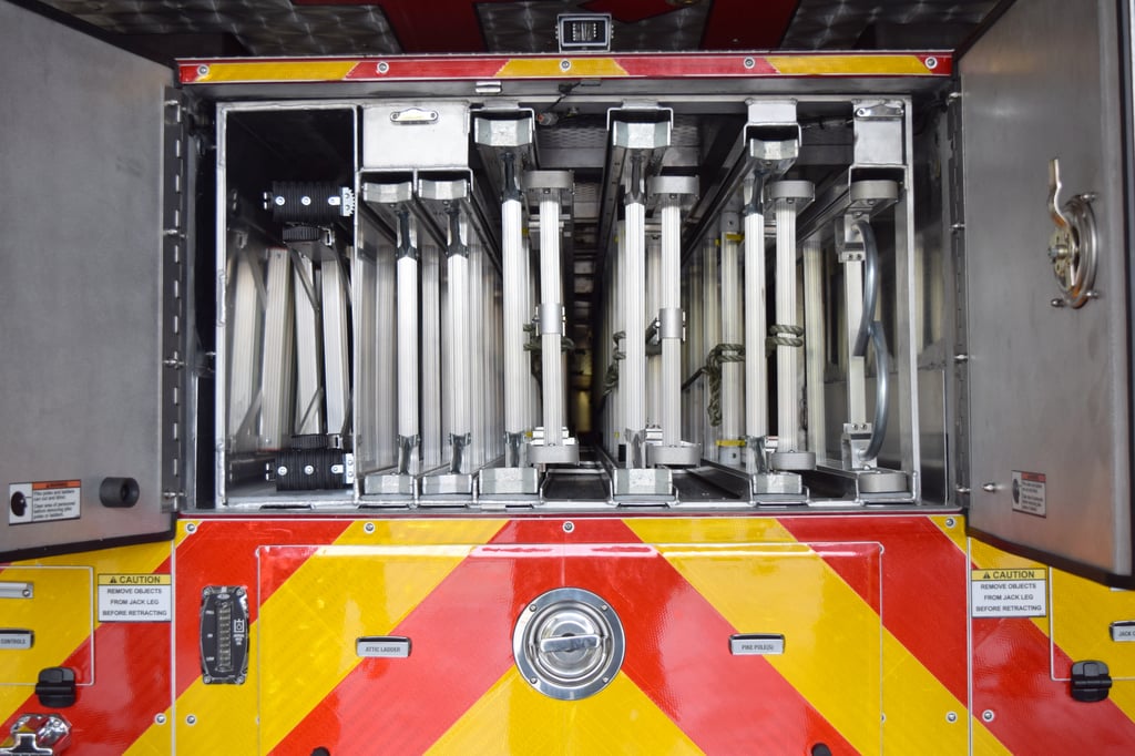 The truck carries eight ground ladders in addition to its large 95-foot aerial ladder with platform. The Tower is also capable of pumping 1,000s of gallons of water per minute through a fixed waterway that extends upward along with the platform.