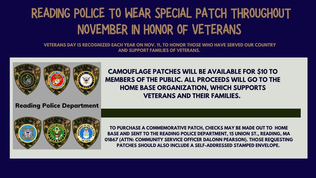 Reading Police will be wearing commemorative patches through November in support of Home Base, an organization dedicated to helping veterans and their families. Officers who are veterans will wear patches pertaining to the military branch they’ve served in, including Army, Navy, Marine Corps, Coast Guard and Air Force.