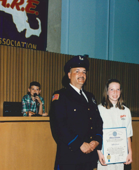 One year, funding ran out for the local D.A.R.E. Program. Longtime D.A.R.E. Lt. Cabral volunteered to continue leading the D.A.R.E. Program in his free time, for no pay. (Photo Courtesy Swansea Police Department)