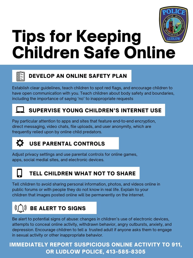 To help families ensure their children are not being victimized online, Ludlow Police would like to share safety tips from the U.S. Department of Justice’s Criminal Division.