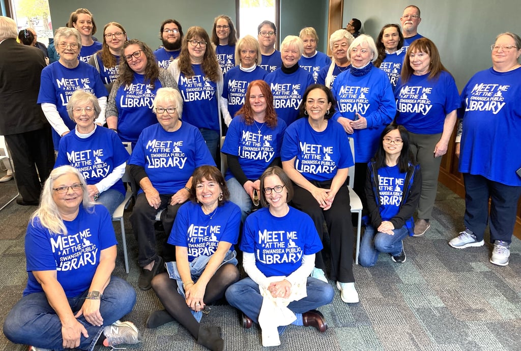 Members of the Friends of the Swansea Public Library attended the ribbon cutting in matching blue T-shirts that read “Meet Me at the Swansea Public Library.” (Photo Courtesy Town of Swansea)