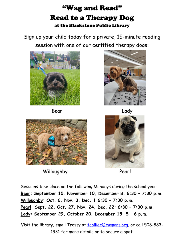 The therapy dogs are back at the Blackstone Public Library and they’re not leaving without hearing a story. Children are invited to read books aloud to a specially trained and certified therapy dog as part of the “Wag and Read – Reading with a Therapy Dog” program. Parents can sign their children up for 15-minute sessions during Monday evening meetups that are scheduled for Dec. 1, Dec. 8 and Dec. 22 from 6:30-7:30 p.m., as well as Dec. 15 from 5 to 6 p.m. This is a chance for children ages 5 and up to practice their reading skills with a certified therapy dog who never complains, judges or spoils the ending.