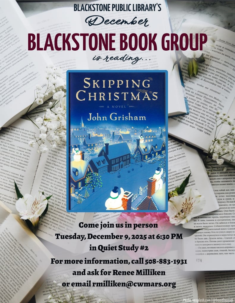 The Evening Book Group, also known as the Blackstone Book Group, offers participants the chance to discuss amazing works of literature with like-minded readers. This month the group is jumping into “Skipping Christmas,” a light, humorous holiday novel by John Grisham. The story is about Luther and Nora Krank, a couple who decide to completely skip the usual Christmas chaos, ditching the no tree, parties and decorations. Instead, the two go on a Caribbean cruise. But their actions send their holiday-obsessed neighbors into an uproar, triggering a series of humorous complications. Copies of the book can be found at the circulation desk.
