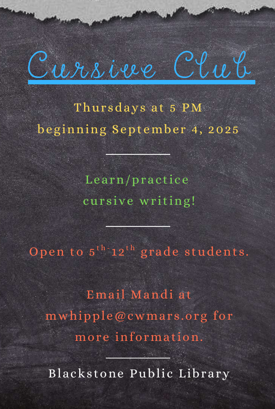 MORE INFO: Call the Blackstone Public Library at 508-883-1931 for more information. This club is sponsored by the Friends of the Blackstone Library.