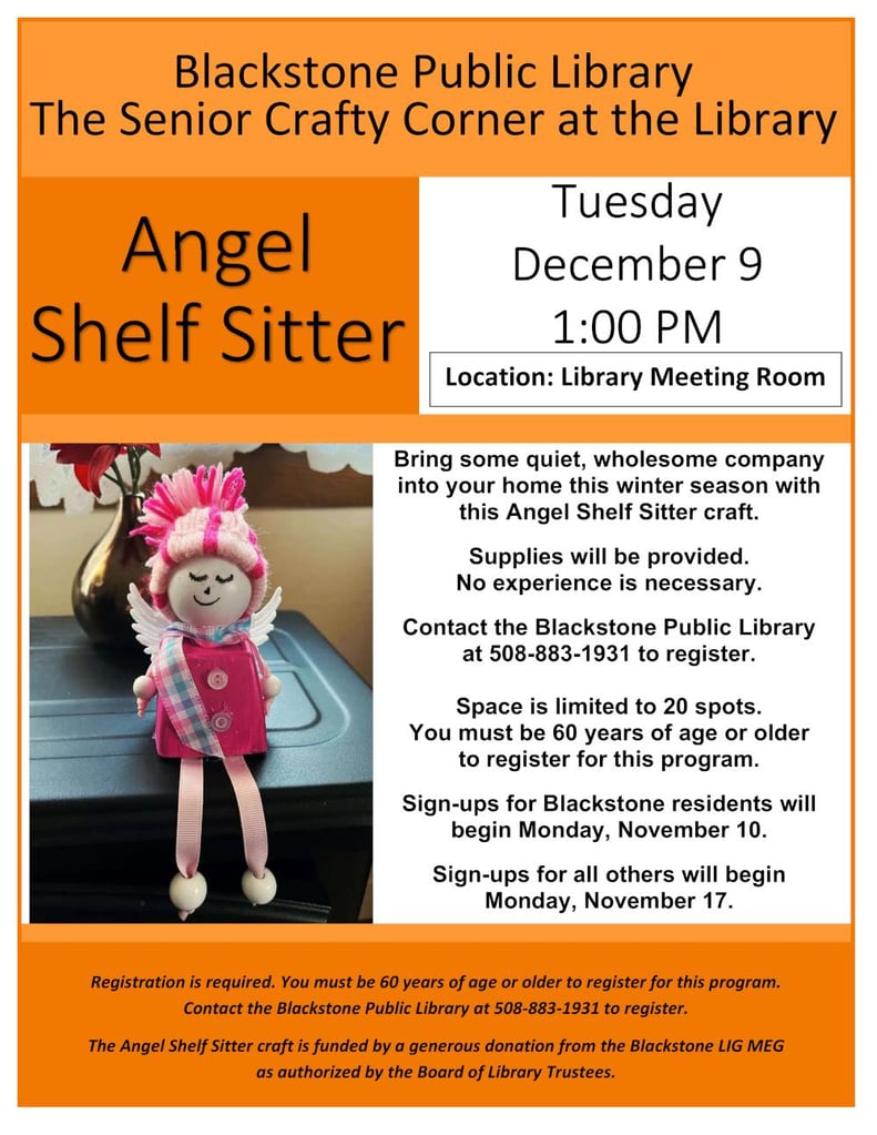 This event at the Blackstone Public Library is a chance to bring a quiet, happy guardian into your home this holiday season. Seniors from the Blackstone community are invited to make angel shelf sitter decorations during this December’s “Senior Crafty Corner” event at the library. All supplies will be provided at the event to help guests to build their own angel to bring home.